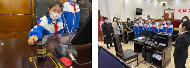 家长和孩子们先后参观了诉讼服务中心、法官墙及审判法庭。在科技法庭,家长和孩子们也亲自坐上了审判台,体验法官的审判工作,并坐在审判席前拍照留念,感受司法的威严。