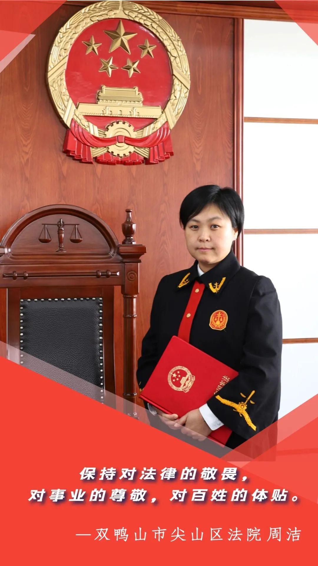 周洁,双鸭山市尖山区人民法院安邦人民法庭庭长,同时她也是法院的办案能手、调解能手。这位从事民事审判工作十余年的女法官,用实际行动践行着司法为民要求,在审判台上发出了耀眼的光芒。先后被市中级人民法院荣记三等功、授予全市法院系统优秀审判员称号、全市法院调解能手称号、年度工作业绩突出个人称号,被尖山区委授予优秀共产党员称号、被省高级人民法院授予全省法院先进个人称号、授予2021年度黑龙江省办案质效优异法官称号,该同志在全省法院学习邹碧华精神主题演讲比赛中荣获二等奖、在黑龙江省高级人民法院举办的全国法院新闻发言人大赛黑龙江选拔赛中荣获二等奖、在黑龙江省第三届“法律职业共同体论坛”演讲比赛中荣获优秀奖。