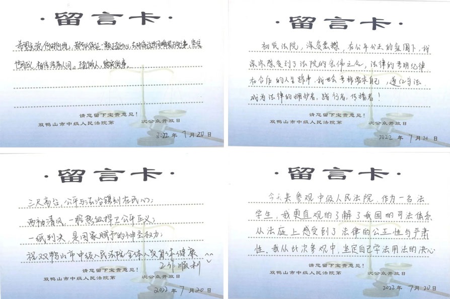 参观后,同学们纷纷表示,此次活动受益匪浅、感受颇多:“一袭法袍护正义,两袖清风为人民。今日,我们一行人走进中级人民法院,在法庭,肃穆的氛围感染着我们,作为新时代的大学生,生在红旗下,长在春风里,在法律的保护下生活,希望全天下的法官身体健康,工作顺利!”