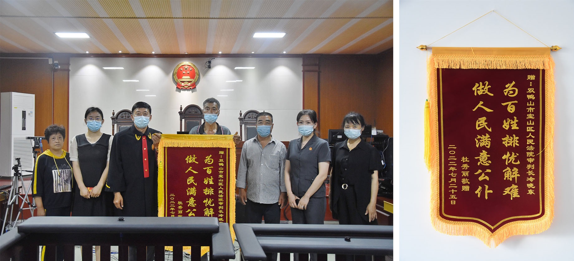 为百姓排忧解难,做人民满意公仆。这是当事人杜某一家为宝山区人民法院冷晓东法官团队送来的锦旗,对冷法官公正、细致、热心的工作作风表示真诚的感谢。