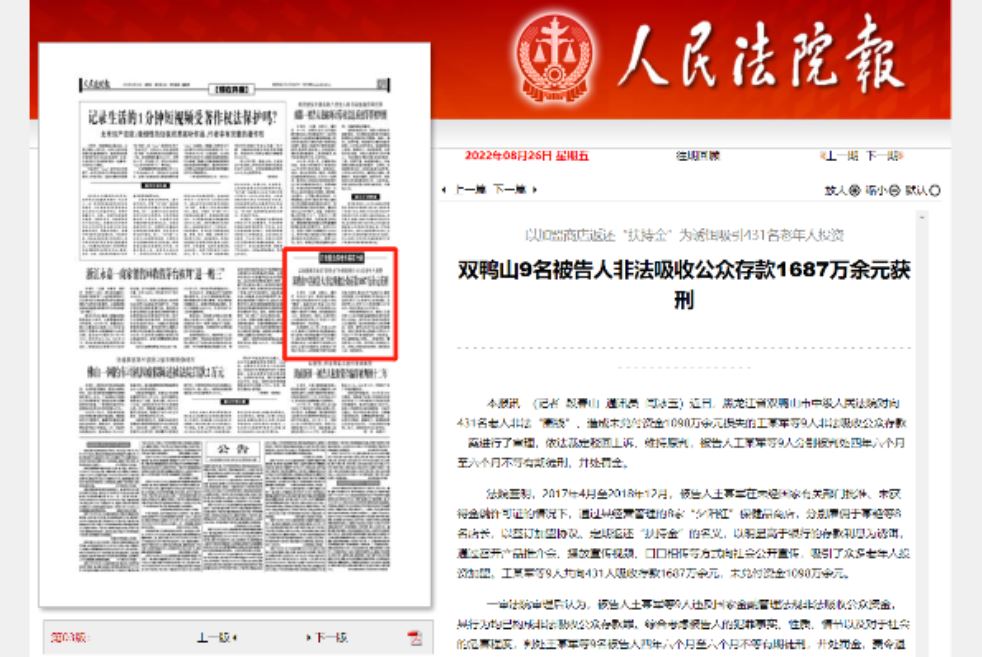 近日,黑龙江省双鸭山市中级人民法院对向431名老人非法“圈钱”、造成未兑付资金1098万余元损失的王某军等9人非法吸收公众存款一案进行了审理,依法裁定驳回上诉、维持原判,被告人王某军等9人分别被判处四年六个月至六个月不等有期徒刑,并处罚金。