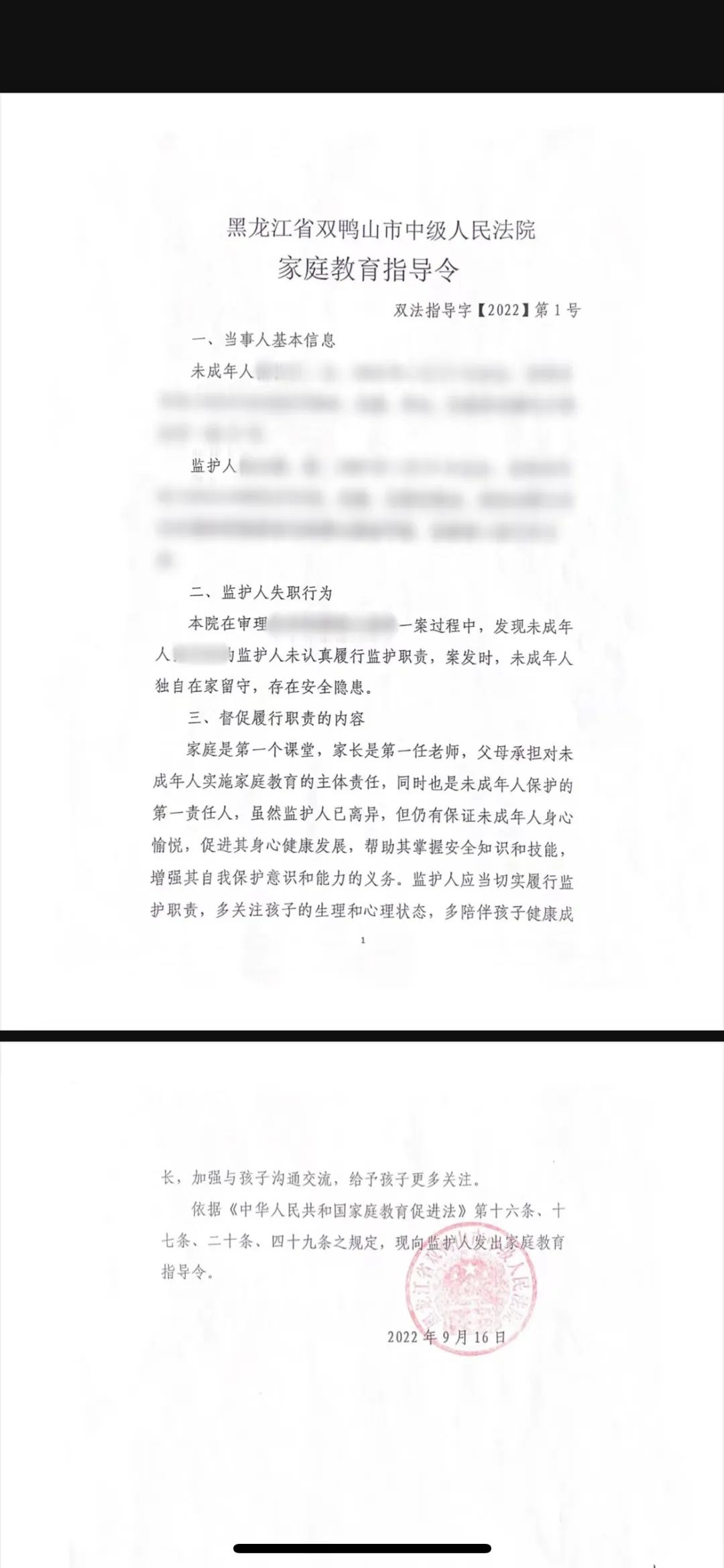 9月16日,双鸭山市中级人民法院依据《中华人民共和国家庭教育促进法》,向留守儿童小雨的父亲发出《家庭教育指导令》,这也是该法实施以来,双鸭山市中级人民法院发出的首份《家庭教育指导令》。