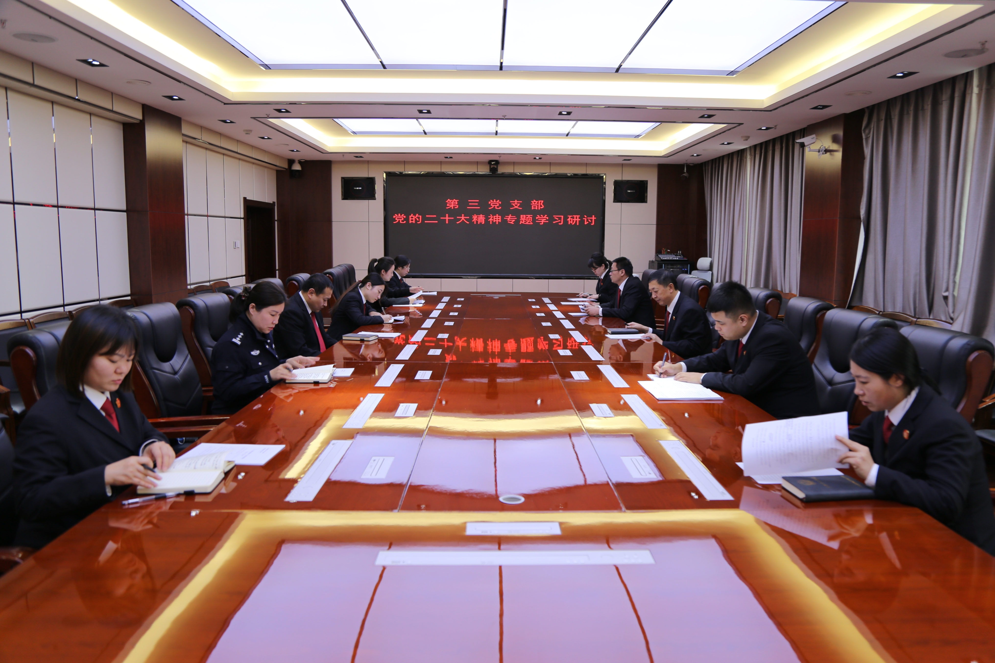 学习要求,要在学懂弄通上下功夫。要把学习宣传贯彻党的二十大精神,作为当前和今后一个时期的首要政治任务,坚持读原文、悟原理,发挥“三会一课”作用,认真学习领悟党的二十大提出的新思想新论断、作出的新部署新要求,系统学习习近平新时代中国特色社会主义思想、习近平法治思想,深刻感悟“两个确立”的决定性意义,增强“四个意识”,坚定“四个自信”,做到“两个维护”。要在学用结合上下功夫。要全面贯彻党的二十大关于贯彻新时代党的建设总要求和全面从严治党工作部署,永葆自我革命精神,牢记全面从严治党永远在路上,认真学习贯彻新修订的《中国共产党章程》和《中国共产党支部条例》,持续加强对党员干警的教育监督管理,营造风清气正的政治生态。要在成果转化上下功夫。要找准党的二十大精神与支部工作的结合点,锚定党的二十大关于坚持全面依法治国、推进法治中国建设的决策部署,坚持抓党建带队建促审判的工作思路,围绕年末考评考核和年初设定的晋位目标,在进一步加强司法政务、后勤保障及司法调研工作上持续发力,不断提升政务保障水平,奋力推动审判执行工作高质量发展。