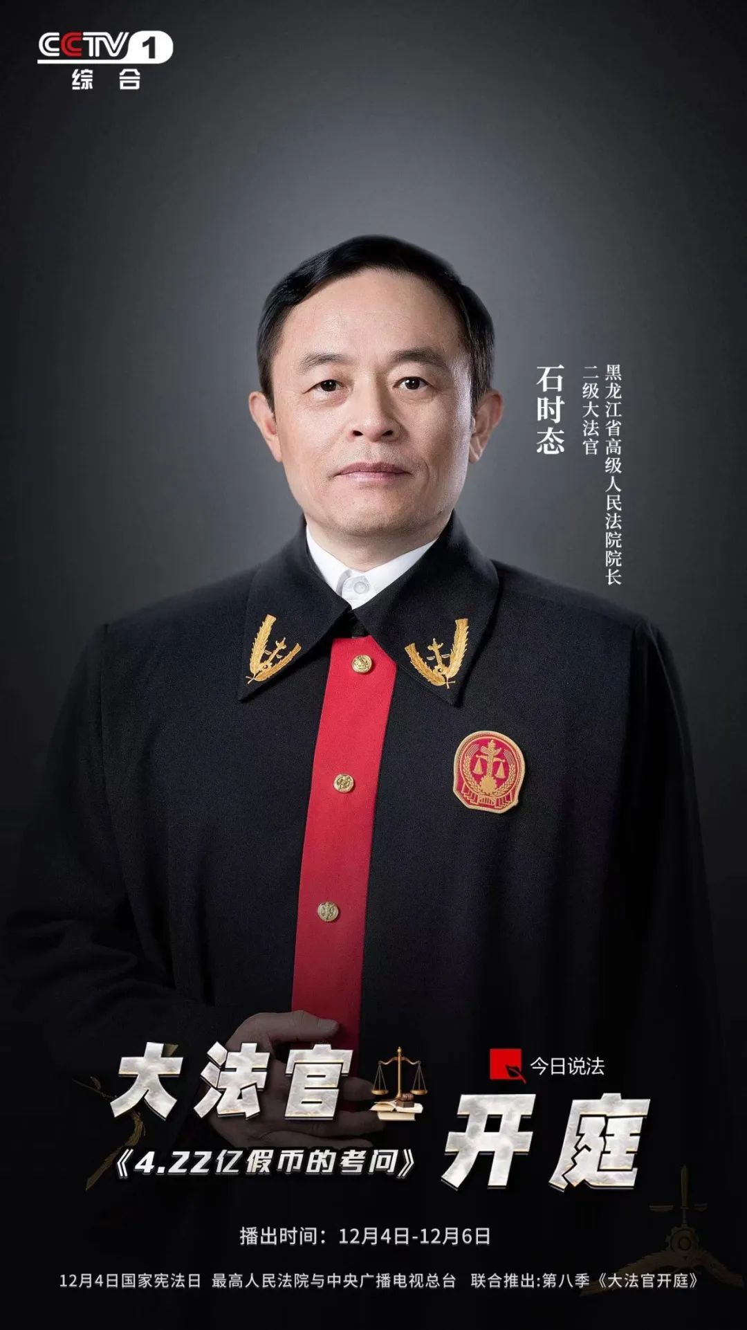 2022年12月4日至6日,中央广播电视总台综合频道《今日说法》栏目将播出《大法官开庭》第八季之《4.22亿假币的考问》。节目中开庭的大法官是黑龙江省高级人民法院党组书记、院长、二级大法官石时态。