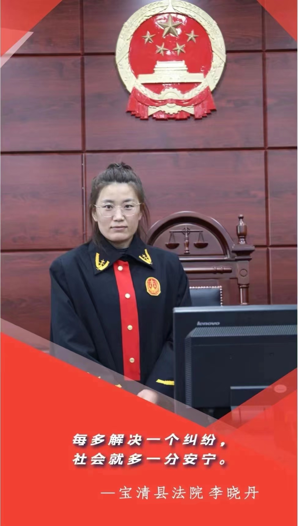 她时刻保持“知敬畏、存戒律、守底线、防红线”的赤子之心,牢记法官使命,积极参与普法工作,延伸司法服务,在工作中追求极致,争创一流,踏实敬业,履职尽责,在思想政治上积极上进,用实际行动诠释了新时代人民法官的忠诚奉献和无畏的担当。