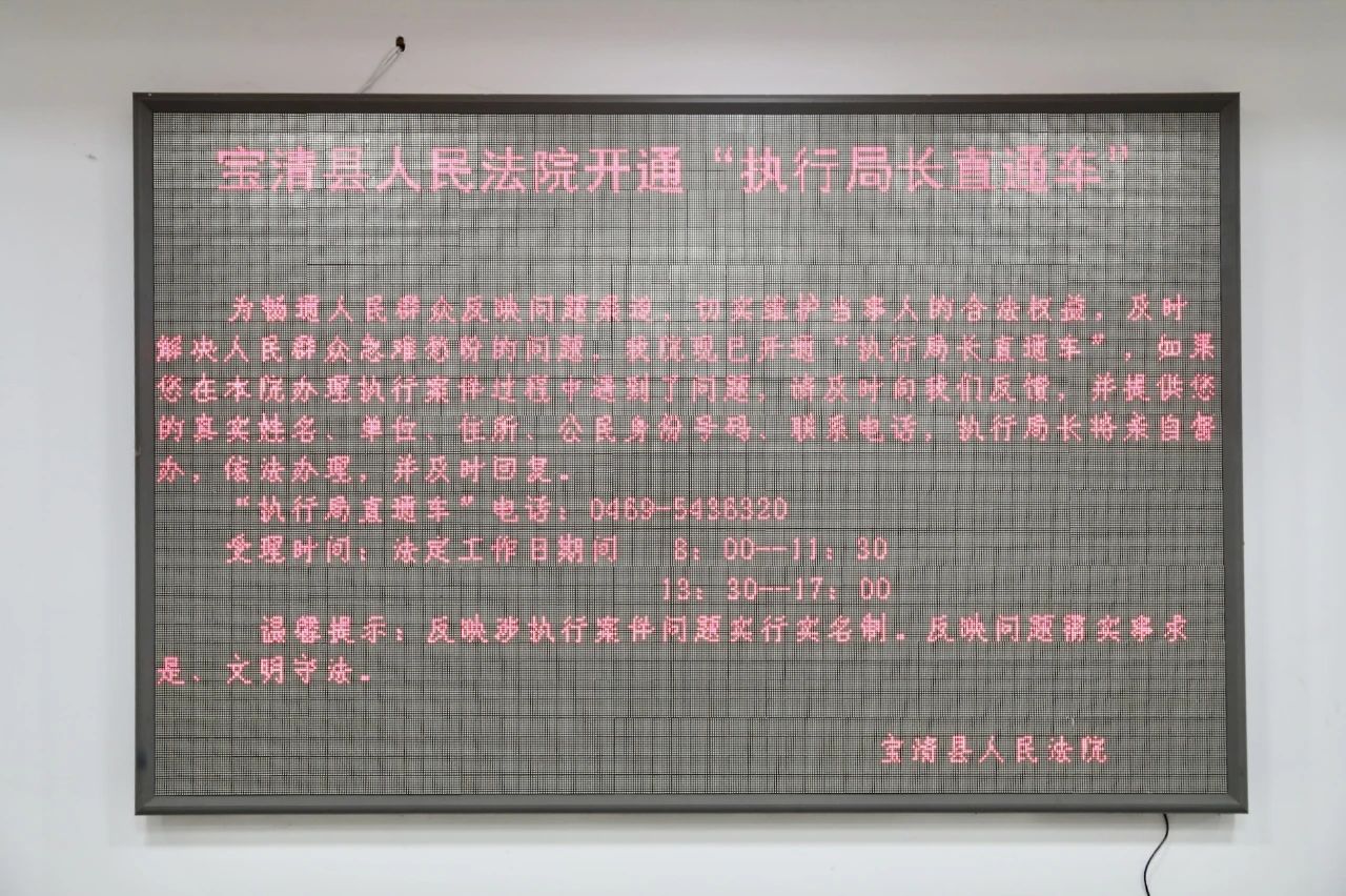 为深入践行“我为群众办实事”活动精神,进一步优化营商环境,畅通人民群众反映问题渠道,切实维护当事人的合法权益,及时解决人民群众急难愁盼的问题,宝清县法院现已开通“执行局长直通车”,主要受理当事人本人在本院办理执行案件过程中遇到的问题,执行局长将亲自督办,依法办理,及时回复,以满足当事人执行诉求。