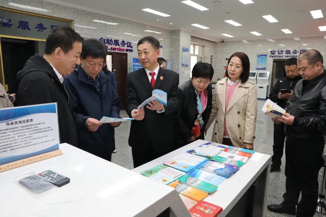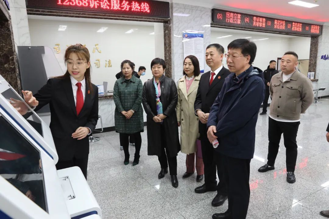 4月18日上午,双鸭山市人大常委会副秘书长孙弘升等一行人到双鸭山中院调研诉讼服务工作,市中院党组副书记、常务副院长李青春,党组成员、副院长于夫鑫陪同调研。