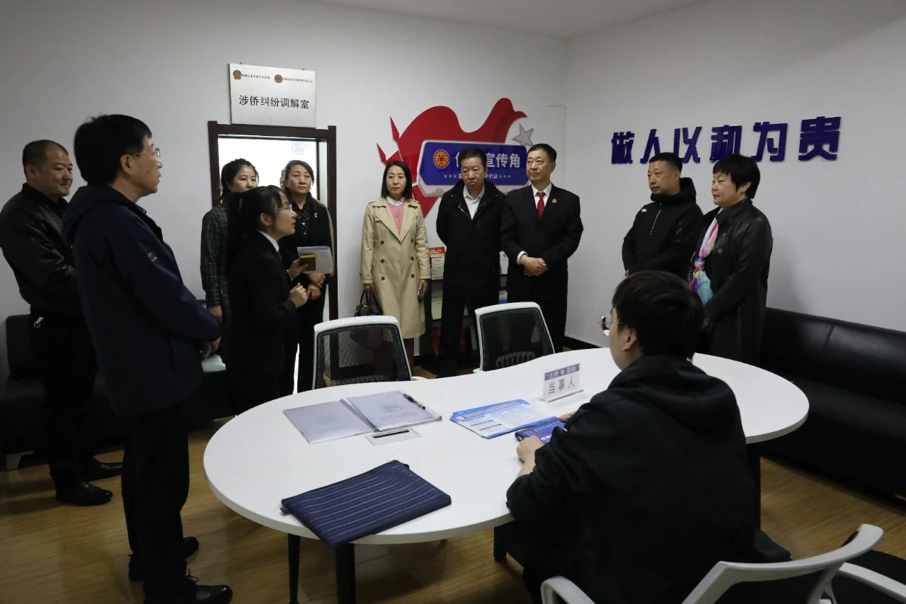 调研组一行人实地参观了诉讼服务中心,现场体验了诉状辅助生成一体机、诉讼风险评估机、自助阅卷机等智能化设备,听取了“一站式”诉讼服务体系的建设情况以及“8+X”多元纠纷化解机制成果介绍。调研组对双鸭山中院的“一站式”建设、诉源治理工作成果予以肯定,并提出应充分发挥涉侨纠纷调解室作用,进一步提高侨法宣传教育水平,不断提升涉侨纠纷化解质效,为侨胞、侨企以及涉侨机构提供更方便快捷的司法服务。