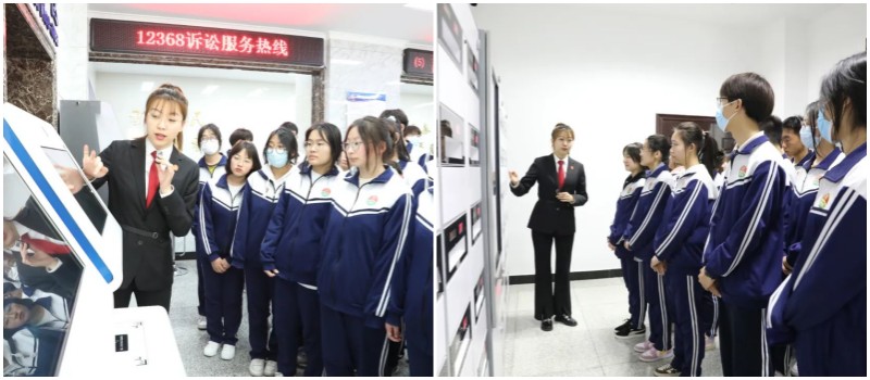 在讲解员的带领下,师生们参观了安检室、诉讼服务中心、刑事审判法庭,同学们走上审判台近距离感受法律的神圣和威严。
