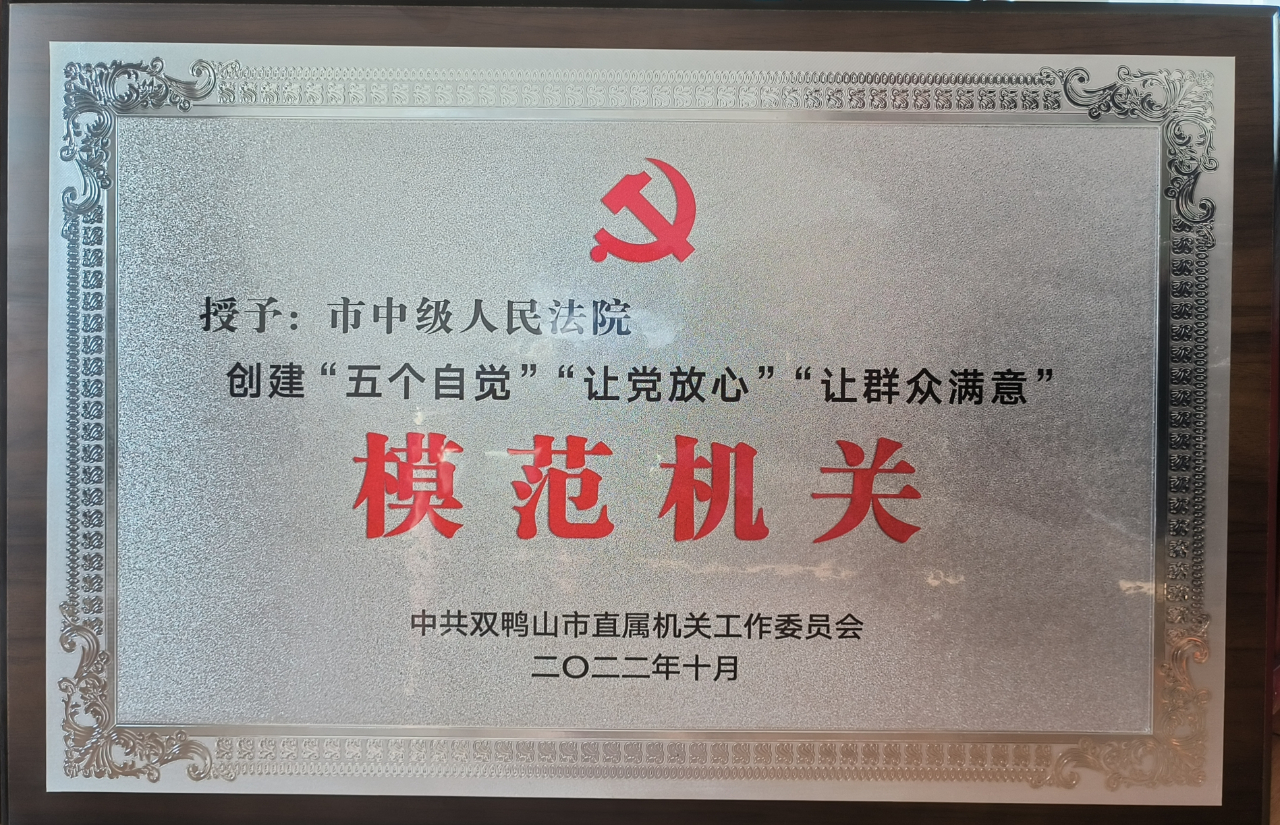 近日召开的全市机关党的建设工作会议上,双鸭山市中级人民法院获颁“五个自觉”“让党放心”“让群众满意”模范机关荣誉称号奖牌,党建工作做法在会上做经验交流。