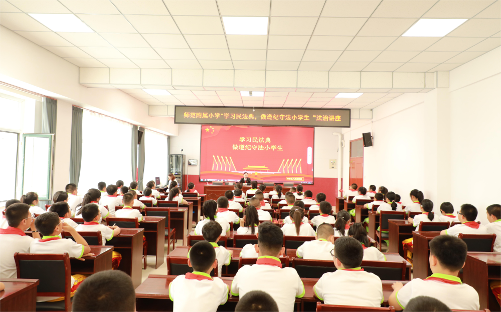 民事审判庭干警、法治副校长王蕾通过发放宣传手册、播放普法视频等方式,向师范附小师生介绍了《民法典》的诞生过程、重要意义和主要内容,并以“《民法典》如何保护未成年人”为重点,以发生在学生身边的事情为依托,开展以案说法,将晦涩难懂的法律条文转化为生动、易懂的语言,深入浅出地为学生们讲授了《民法典》知识。