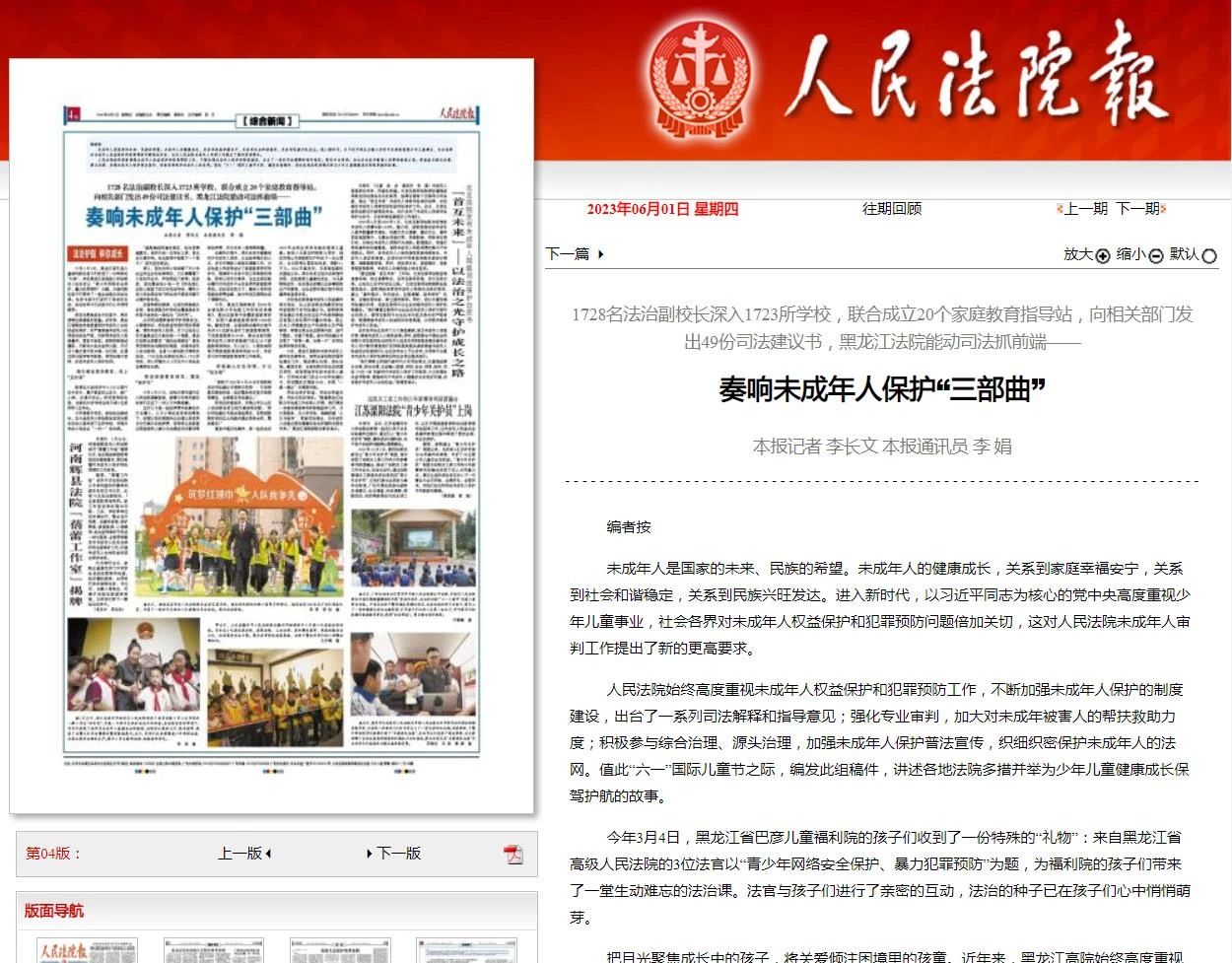 尖山区人民法院始终高度重视未成年人权益保护和犯罪预防工作,不断加强未成年人保护的制度建设,强化专业审判,加大对未成年被害人的帮扶救助力度,积极参与综合治理、源头治理,加强未成年人保护普法宣传,织细织密保护未成年人的法网。“六一”国际儿童节之际,《人民法院报》第4版刊发文章《奏响未成年人保护“三部曲”》,文章讲述尖山区人民法院为少年儿童健康成长保驾护航的故事。