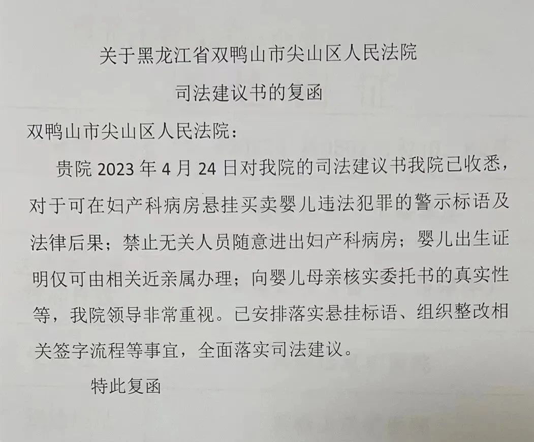 为杜绝此类侵害未成年人权益案件再次发生,尖山区法院在结案后依法向该医院下发司法建议书。医院按照司法建议书提出的应在产科病房悬挂买卖婴儿系犯罪行为警示标语、禁止无关人员随意进出产科病房以及严格审核、审慎出具出生证明等内容,进行了整改,完善了制度。该份司法建议书实现了“审理一案,治理一片”的司法效果和制发初衷。