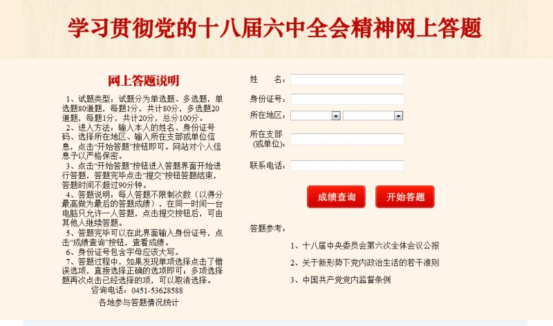 12月13日,按照《黑龙江省党员干部现代远程教育中心关于组织开展全省党员“学习贯彻党的十八届六中全会精神”网上答题活动的通知》要求,双鸭山市中级人民法院组织全院党员及入党积极分子近百人参加答题活动,此次活动以党支部为单位,做到全员参与,应答必答,截止12月20日下午,全院近百分之五十的党员及入党积极分子完成答题,平均分为85分以上。
