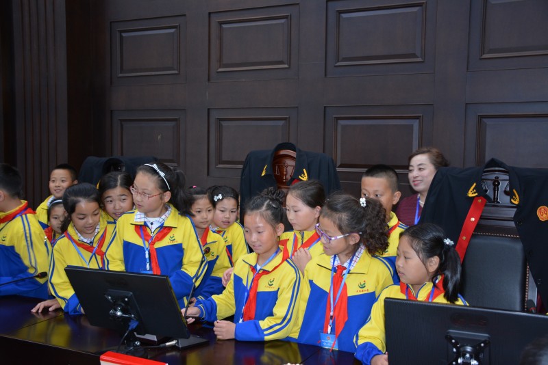 在讲解干警的引导下,师生们对法院的诉讼服务大厅,审判法庭、文化长廊、羁押室等进行了参观,讲解干警用通俗易懂的语言对各部门的功能及法规、法徽、法槌、法袍的含义和作用、案件的基本办理流程等进行讲述。在刑事审判法庭,同学们争先恐后地坐上审判席,用小手敲响法槌,兴致勃勃地扮演庭审角色,近距离感受法律的庄严和神圣。参观结束后,在法院干警的带领下,孩子们用那字正腔圆的童音大声宣读了法官誓词,深深的体会到了其中的责任与担当。