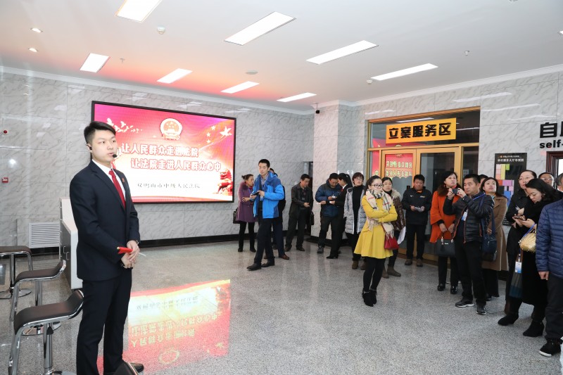 在工作人员的讲解下,参观人员对诉讼服务中心和科技法庭、司法公开三大平台、科技法庭的同步录音录相、庭审同步直播大加赞许。