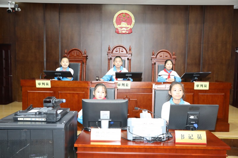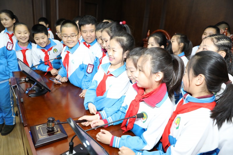 在诉讼服务中心,讲解员用通俗易懂的语言对各部门的功能及法徽、法槌、法袍的含义和作用、案件的基本办理流程等进行介绍。在科技法庭,同学们有序的坐上审判席,用小手敲响法槌,兴致勃勃地扮演庭审角色,组成了“未来合议庭”,过了一次当法官的“瘾”,近距离感受法律的庄严和神圣。