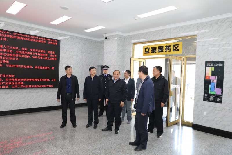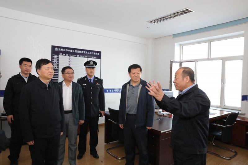 2018年4月25日,省法院副院长邹鹏、法警总队总队长牛天治等一行三人,深入双鸭山市法院开展诉讼服务窗口集中治理等项督导检查。中院党组书记、院长田守明陪同检查。